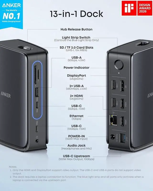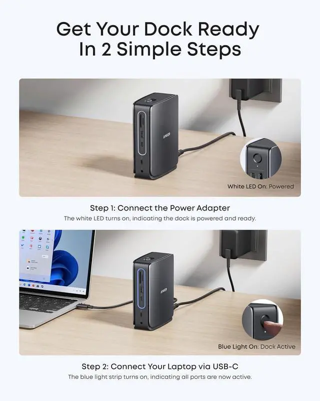 - The dock requires a laptop connection to function. The blue light strip and all ports only activate when a laptop is connected via the upstream port.