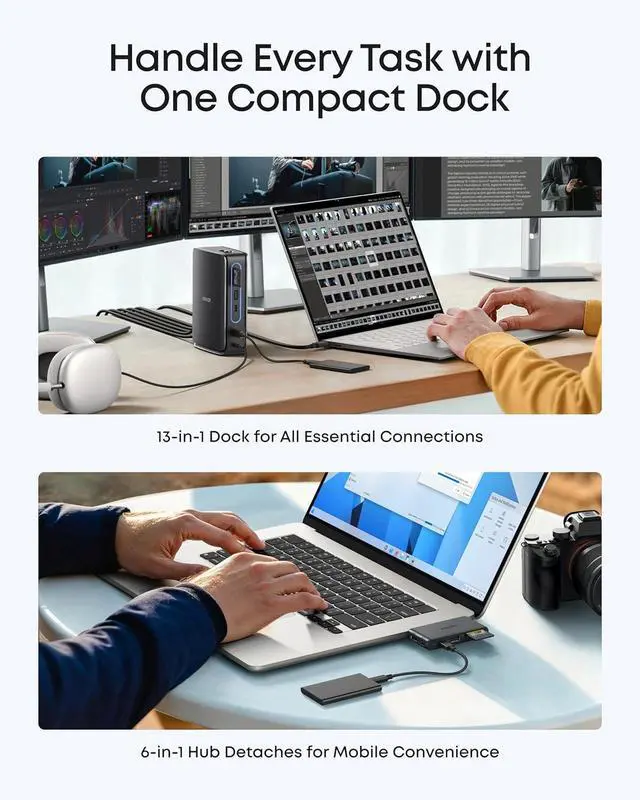 13-in-1 Dock and Hub: Built for peak efficiency, the 13-in-1 dock pairs with a 6-port portable hub to keep you connected anywhere. The compact power adapter helps maintain a cleaner, clutter-free workspace.