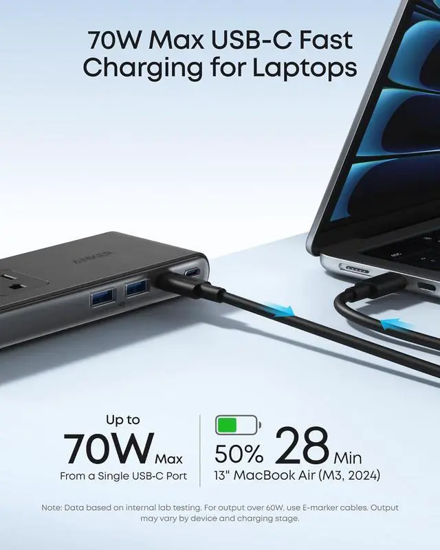 Charge a MacBook, tablet, or iPhone with flexible power output. A single USB-C port delivers up to 70W to support everything from laptops to earbuds.