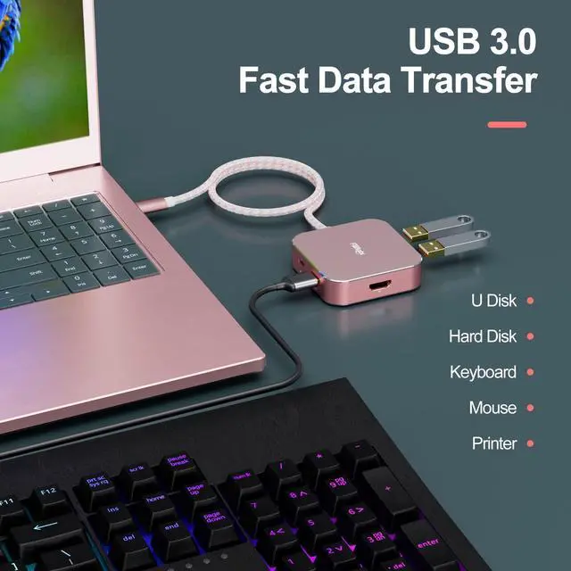 Fairikabe 5 in 1 USB C Hub is a great USB C multiport adapter for your USB-C/Thunderbolt 3 laptops. It's a USB C to HDMI adapter, allow your laptop computer to extend/mirror an additional 4K monitor, perfect partner for multitasking and improve your productivity. With 3 USB-A 3.0 port, which support standard 5Gbps data transfer speed, convenient to connect hard drive, keyboard, mouse and other USB accessories via USB-C connector, functioned as 3 USB C to USB A adapters. With this USB C dock, you can also charge your laptop via the USB-C power pass through port.