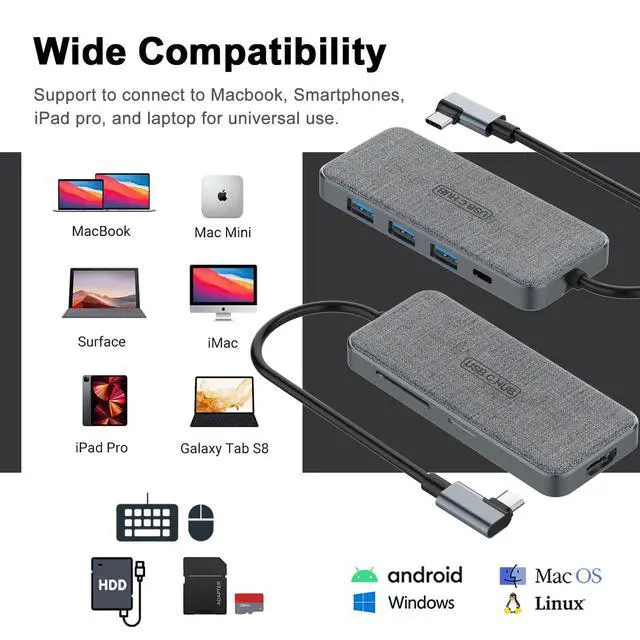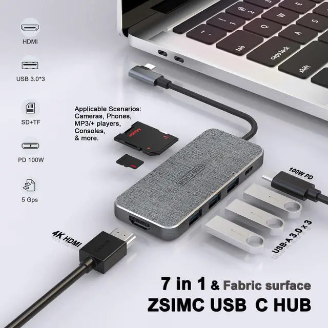7-in-1 USB C AdapterExpand more ports to connect more. ZSIMC USB C Hub features a 4K HDMI (3840x2160) output port, SD and TF card readers, 1 Type C PD-3.0 100W charging port and 3 USB A 3.0 Gen 1 (5Gbps) ports. All hub ports can work simultaneously and save you the trouble of plugging & unplugging repeatedly, allows you to keep a sleek workspace. The USB C Adapter has perfectly combined all the functions you need.