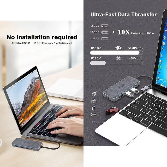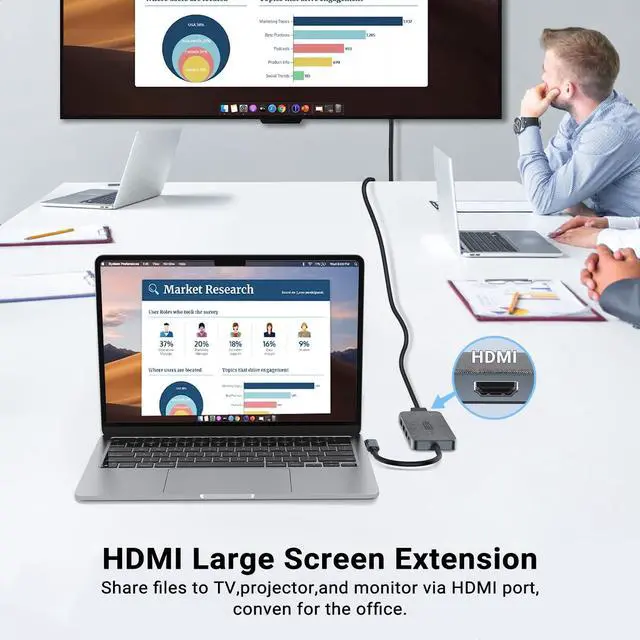 HDMI Port for 4K UHD Visual FeastThe USB C hub HDMI port supports media display at resolutions up to 4K(3840x2160@30Hz) or full HD 1080P. Mirror or extend your screens and directly stream video to HDTV, monitor or projector with a resolution up to 4K at 30Hz via HDMI port. Ideal for business conferences, presentations, classroom, gaming or watching movies.