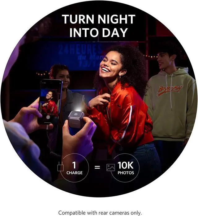 Connect the built-in Lightning cable to your iPhone 11 and make sure your phone’s flash function is on for instant and flawless synchronization with your phone’s rear cameras. Compatible with iPhone camera app and 3rd party camera apps.