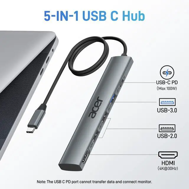 | - | This USB-C hub has 5 ports: HDMI (4K@30Hz), USB-C PD (100W), USB-A 3.0, and 2 USB-A 2.0 ports. |