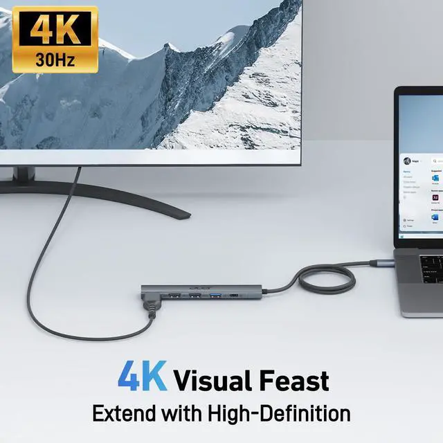 Effortlessly expand your device with this USB-C hub featuring 4K HDMI, 100W PD charging, USB 3.0, and dual USB 2.0