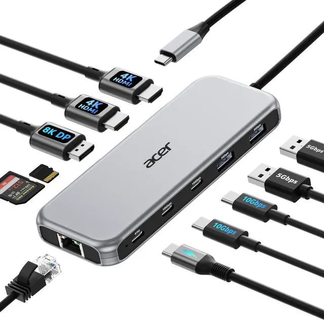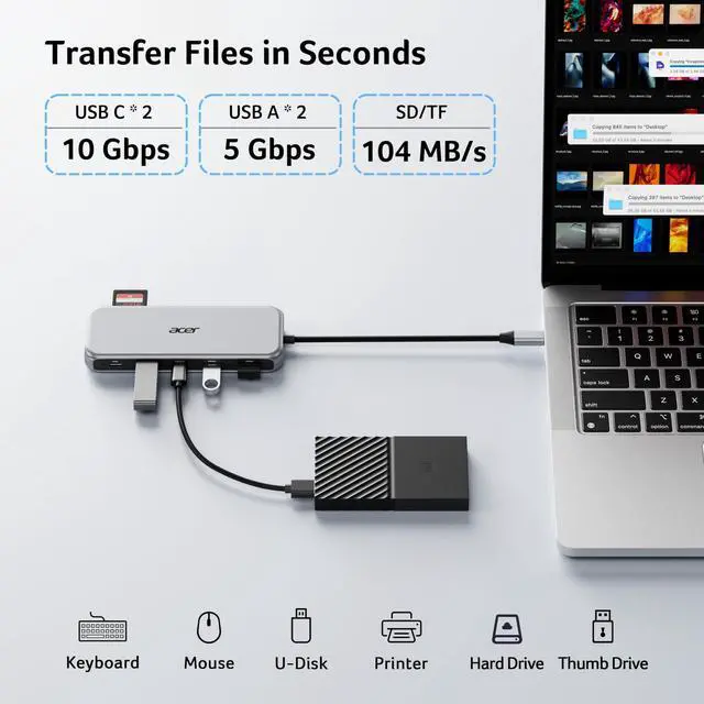 Super-Fast 10Gbps Data TransferThis usb c hub multiport adapter includes 2 USB-C for 10Gbps, 2 USB-A for 5Gbps, and SD/MicroSD slots for 104Mbps high-speed file transfers. Perfect for photographers, designers, and data-intensive professionals.