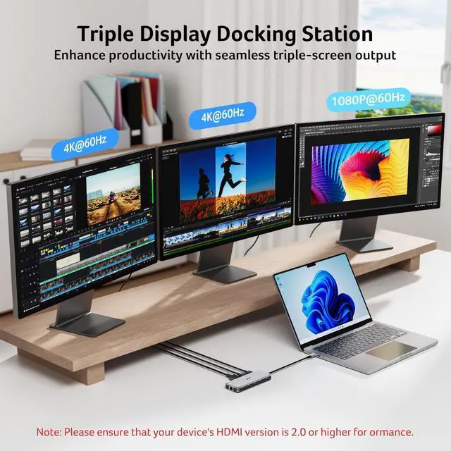 Brilliant Triple Display ExpansionThis docking station 3 monitors supports single display up to 8K@30Hz on DP or 4K@60Hz on HDMI. Dual displays run at 4K@60Hz, ideal for docking station dual monitors. Triple displays automatically allocate resolutions based on each monitors capabilities (EDID) and total bandwidth, typically 4K@60Hz + 4K@60Hz + 1080P@60Hz, perfect for triple monitors docking station.Note: For optimal performance, please ensure your devices HDMI version is 2.0 or higher.