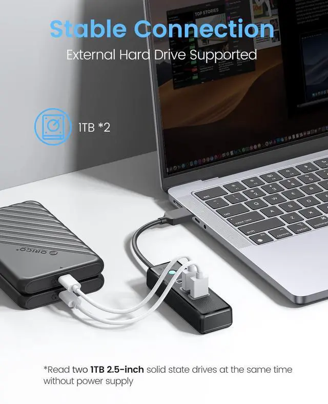 This hub can read two 1TB 2.5" solid state drives at the same time without power. To ensure a stable connection, it is recommended that this hub is not used at the same time as a high power consumption device such as a high capacity hard drive.