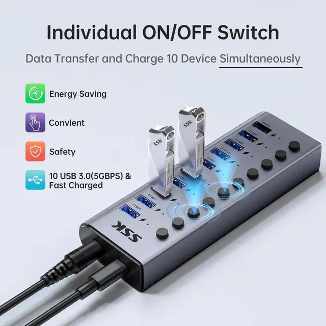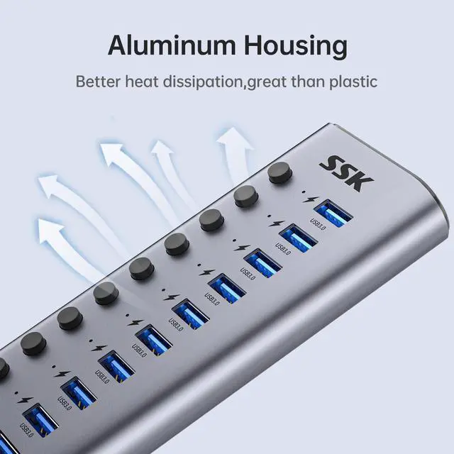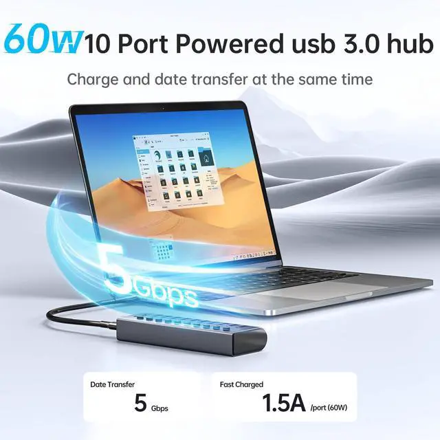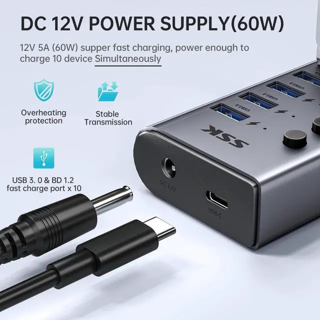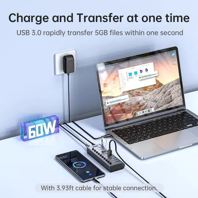10-Port Powered USB 3.0 Hub, 60W Aluminium USB Charging Hub with DC 12V5A Power Adapter, Supports Simultaneous Fast charge and 5Gbps Data Transmission,USB Extender Hub with 3.96ft/1.2m Long Cable
