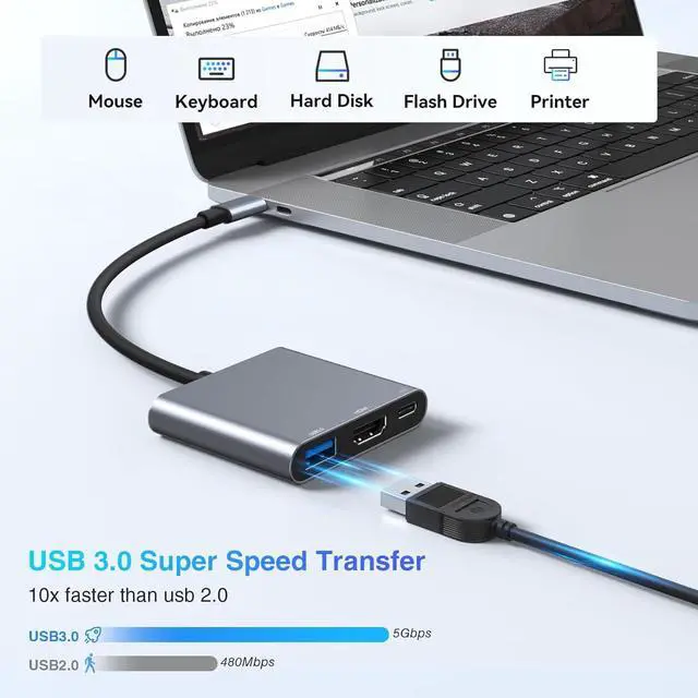 Allowing you to charge your laptop at high speed while using this USB-C Digital AV Multiport Adapter. No need to worry about power storage. Note: The USB-C port only supports power delivery and does not support data transfer.