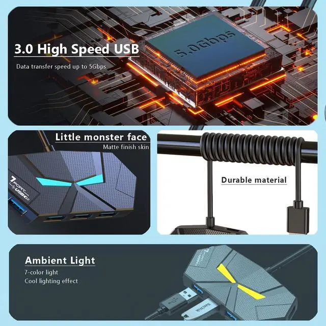 • SuperSpeed Data TransferWith high efficient USB3.0, 4-port USB splitter. you can transfer movies, photos, and files in seconds at speed up to 5Gbps. When connecting devices that require power, you can charge through the 5V USB C power port to ensure stable and fast data transmission.