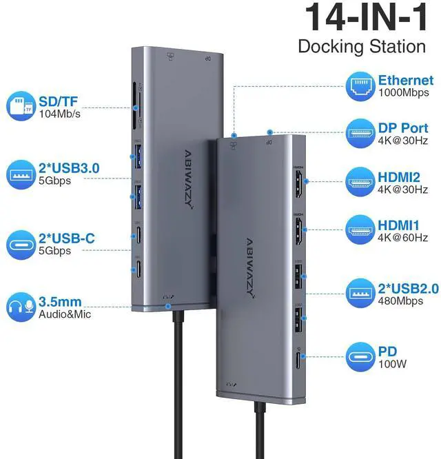 This ABIWAZY 14 IN 1 USB-C Computer Hub Docking Station is universally compatible with laptops which built-in Typce C port that supports video output, data output and charging. The laptop docking station for dell can easily extend your laptop from 1 port to 14 ports: dual UHD 4K HDMI, DP displayport, 100w PD, RJ45 port, 2 USB-A 3.0, 2 USB-C Data Transfer port, 2 USB-A 2.0, SD & TF Card reader and 3.5mm Audio/Mic 2 in 1 jack. With this USB Type C Dock adapter, you can watch large-screen images/videos on high-definition TVs, monitors, and projectors through the HDMI port. Connecting 2 HDMI, 1 DP at the same time can mirror or extend dual/triple or even quadruple display.