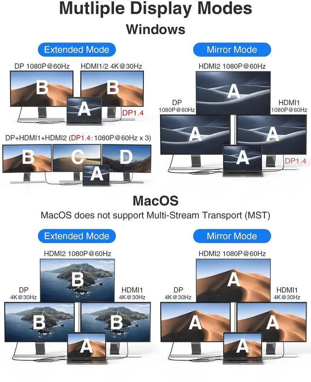 (When it works with single display, If you want to HDMI1 output 4K@60Hz resolution, your laptop needs to support DP1.4 output).