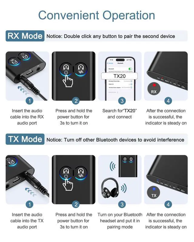 In RX mode, if there is audio delay, press and hold for 3 seconds to switch to low-latency gaming mode.