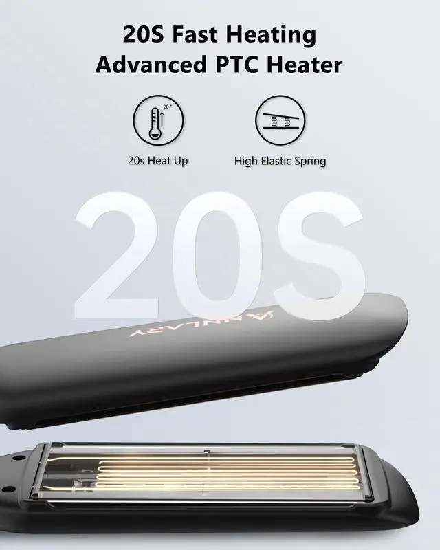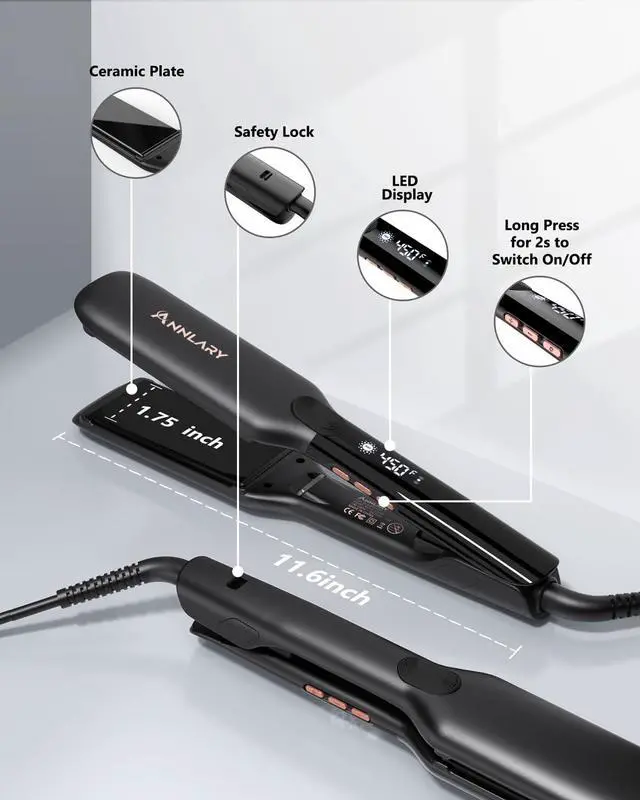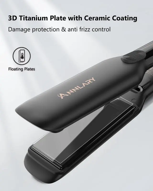The ANNLARY hair straightener ensures fast, smooth, and long-lasting results thanks to its advanced ionic technology and 3D Titanium Plate with Ceramic Coating. With a 70.9-inch power cord for easy movement and an intuitive switch that activates with a 2s press, styling your hair has never been easier. Enjoy professional-quality hairstyles right from the comfort of your home!