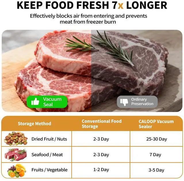 Keep Food Fresh 8X LongerCALOOPs advanced sealing technology and powerful suction remove more air, locking in flavor and nutrients. Extend food freshness for weeksreduce waste, save money, and free up fridge space effortlessly.