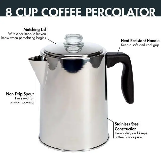 The Primula Stainless Steel Stovetop Coffee Percolator brews up to 8 cups of rich, smooth coffee from the convenience of your home. Crafted from premium stainless steel for long-lasting performance and durability. It features a removable filter basket that eliminates the need for messy disposable filters. The heat-resistant handle and non-drip spout make for safe and mess-free pouring. The coffee pot and filter are dishwasher safe for easy cleanup; we recommend hand washing the lid. Lastly, the percolator works on electric, ceramic and gas stovetops including propane, making it the perfect camping coffee pot. To use, simply fill with water to the fill line marked 8-cups, add coffee grounds to the removable filter basket, and secure the basket in the coffee pot. Place the coffee maker on the stovetop and turn the heat to medium-low. Make sure to position the handle away from the heat source. Once the water starts to boil, the coffee will begin to percolate. Monitor the brew strength by watching the coffee percolate in the clear glass knob on top of the lid. Once the coffee has reached your desired strength, remove from heat and enjoy. The Primula Stainless Steel Coffee Percolator is a great way to brew delicious, fresh coffee at home, saving you time and money. Visit the Primula Brand Store for more award-winning coffee and tea must-haves!