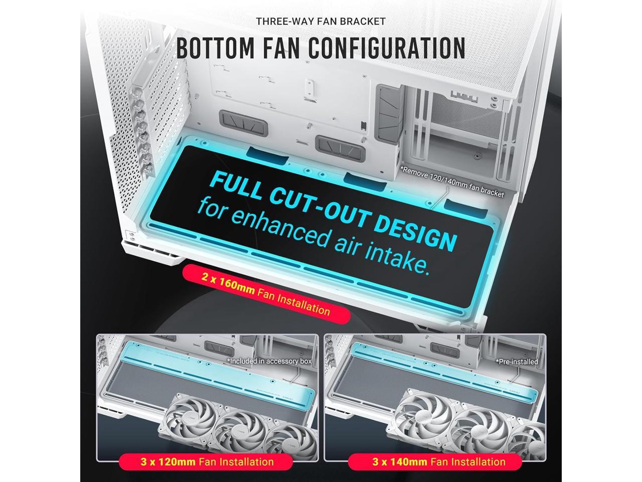 - Full Cut-Out at Bottom with Interchangeable 120mm/140mm Fan Brackets.