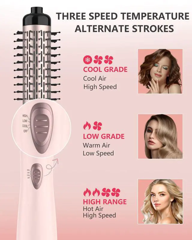 3 Setting Modes: Our rotating blow dryer brush is selected from three heat settings to suit every hair type: cool, low, and high. The 1000W motor heats up quickly for efficient styling, and the included diffuser ensures even heat distribution, shielding your hair from heat damage with our blow out brush dryer