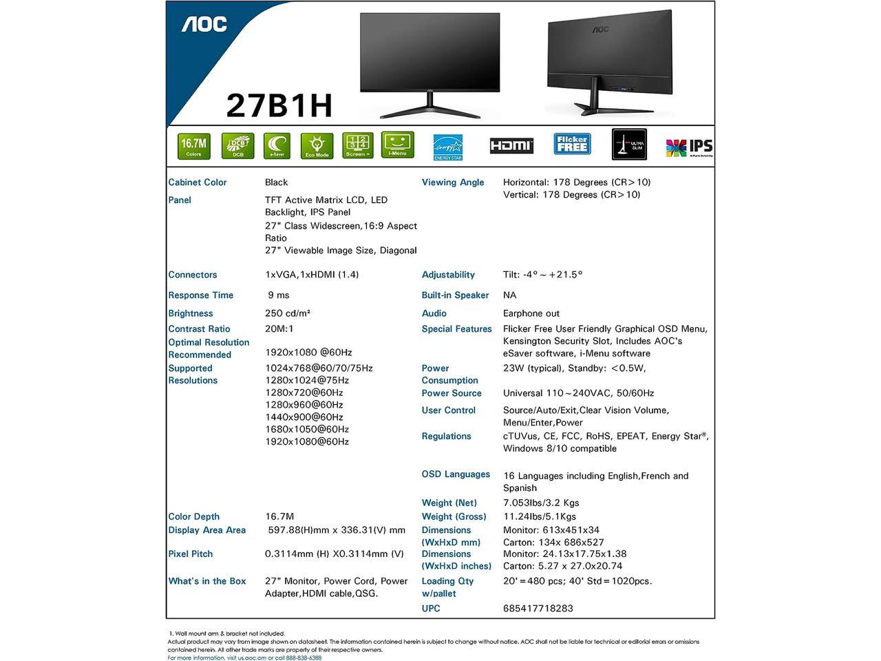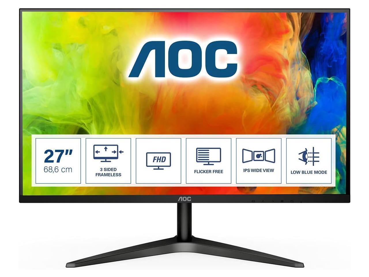 AOC 27B1H 27" Full HD 1920x1080 monitor, 3-sided frameless, IPS Panel, HDMI/VGA, AOC Flicker-Free, ClearVision, 20M:1 Contrast