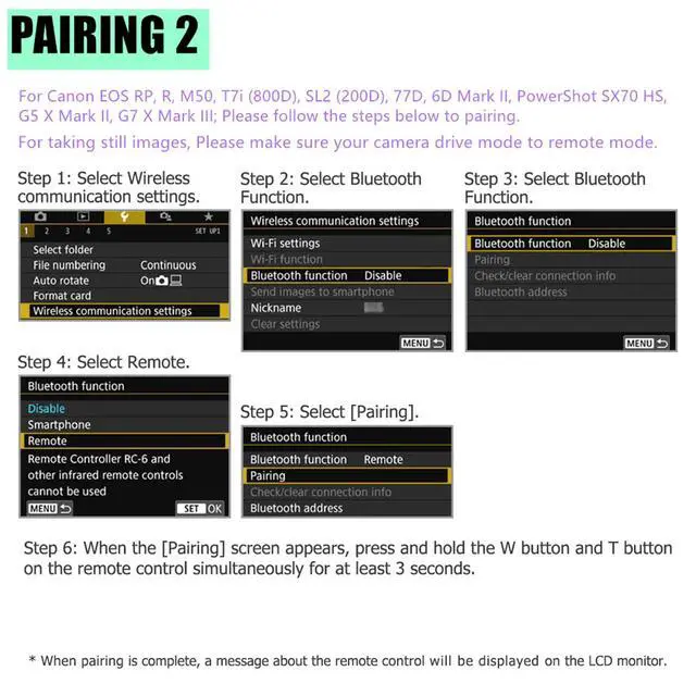 - Pairing: 2. select "wireless communication setting "- select "bluetooth function"- select "remote"- select "pairing", in this step, hold and press the W and T on remote control simultaneously for 3 sec. or more. The indicator will blink in the pairing process, and it will blink one more time when pairing is complete.