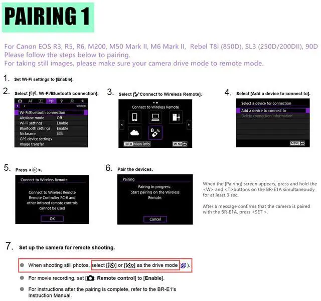 1.For your camera setting: go to setting under the wrench settings - choose wireless communication - choose function - choose remote.