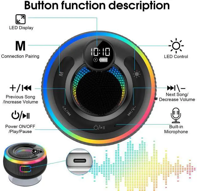- Compact & Long-Lasting Power: This 95*95.2*56mm portable speaker bluetooth, with a 1000mAh battery for up to 8 hours of playtime, is ideal for bathroom use and other wet environments. Enjoy uninterrupted music in the shower or around the house without worrying about recharging. Sleek, portable, and perfectly suited for any room or adventure!Note: Short press the forward/backward button to switch songs, long press to adjust the volume. )