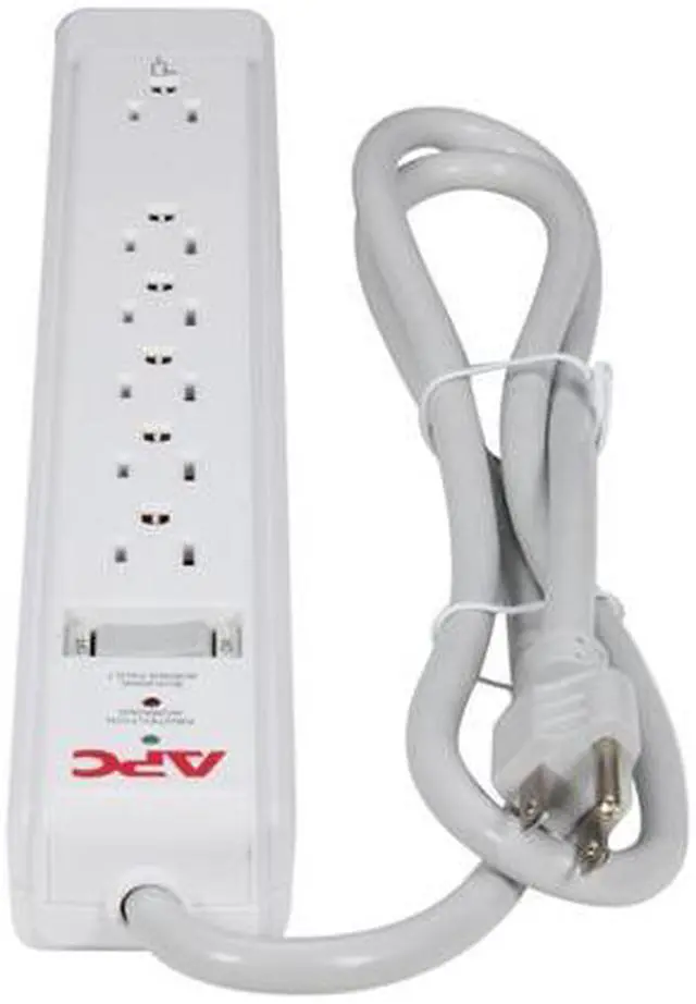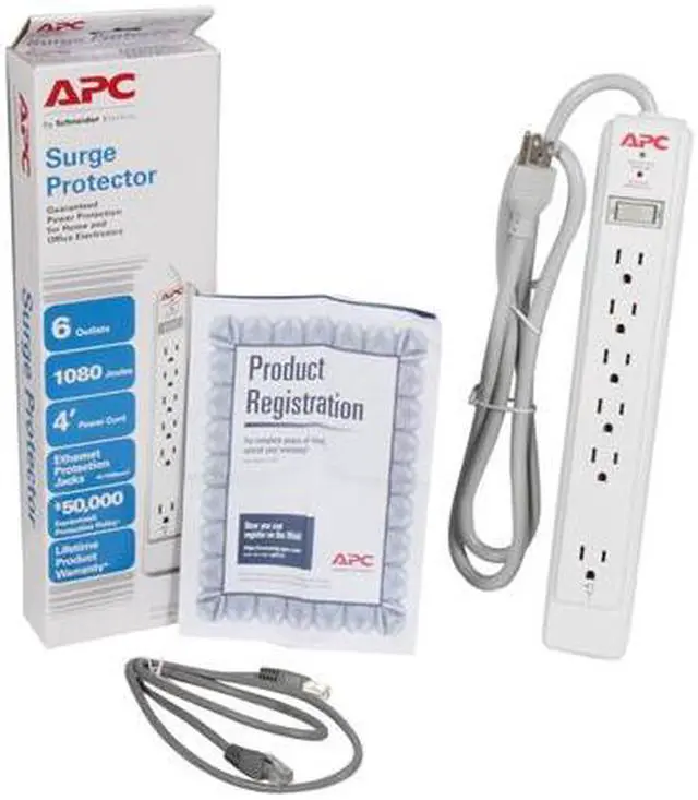 Damaging surges associated with lightning or utility problems can travel along your utility and data lines, damaging your electronic devices and destroying your valuable data. Even smaller everyday surges can degrade the performance of your electronics and decrease their life. The APC SurgeArrest Essential series represents the minimum level of surge protection that should be present on any of your computers and household electronics, with most models also providing surge protection for your phone lines. Its state of the art circuitry offers protection for sensitive electronic equipment against larger surges and multiple surge events. Additional features like plentiful outlets, status indicator LEDs and more make this our best value for surge protection - our lifetime Equipment Protection Policy guarantees it.Plug/Connector Type: NEMA 5-15PReceptacles: 6 x NEMA 5-15RDataline Protection: RJ-45 NetworkInput Voltage: 120 V ACOutput Voltage: 120 V ACCurrent: 15 A Line Current/72 kA Surge CurrentSurge Energy Rating: 1080 JPower Cord/Cable: 4 ftHeight: 13Width: 2"Depth: 1.5"Weight (Approximate): 12.80 ozPackage Contents: SurgeArrest Essential P6N 6-Outlets Surge SuppressorCat 5 Ethernet CableUser ManualLimited Warranty: LifetimePackage ContentsSurgeArrest Essential P6N 6-Outlets Surge SuppressorCat 5 Ethernet CableUser Manual"