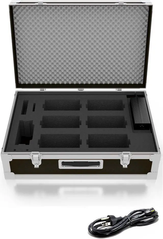 All fixtures automatically dock on charging ports when placed in the case so there is no need for individual cables. The built-in 108 Watt power supply can charge (6) Maxi 2.0 s and (1) W-App in approximately 5 hours.