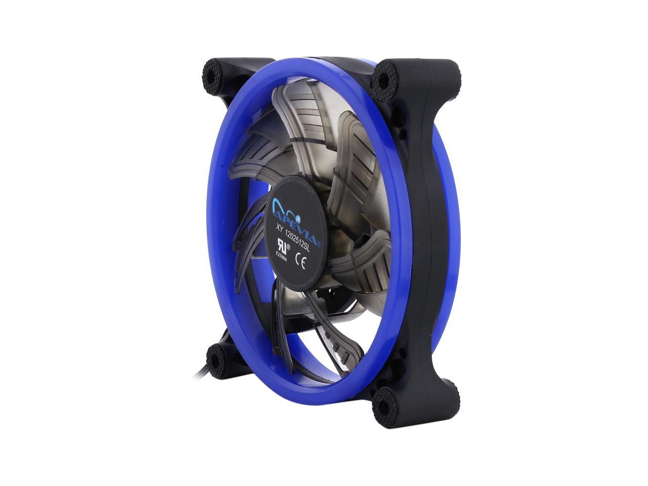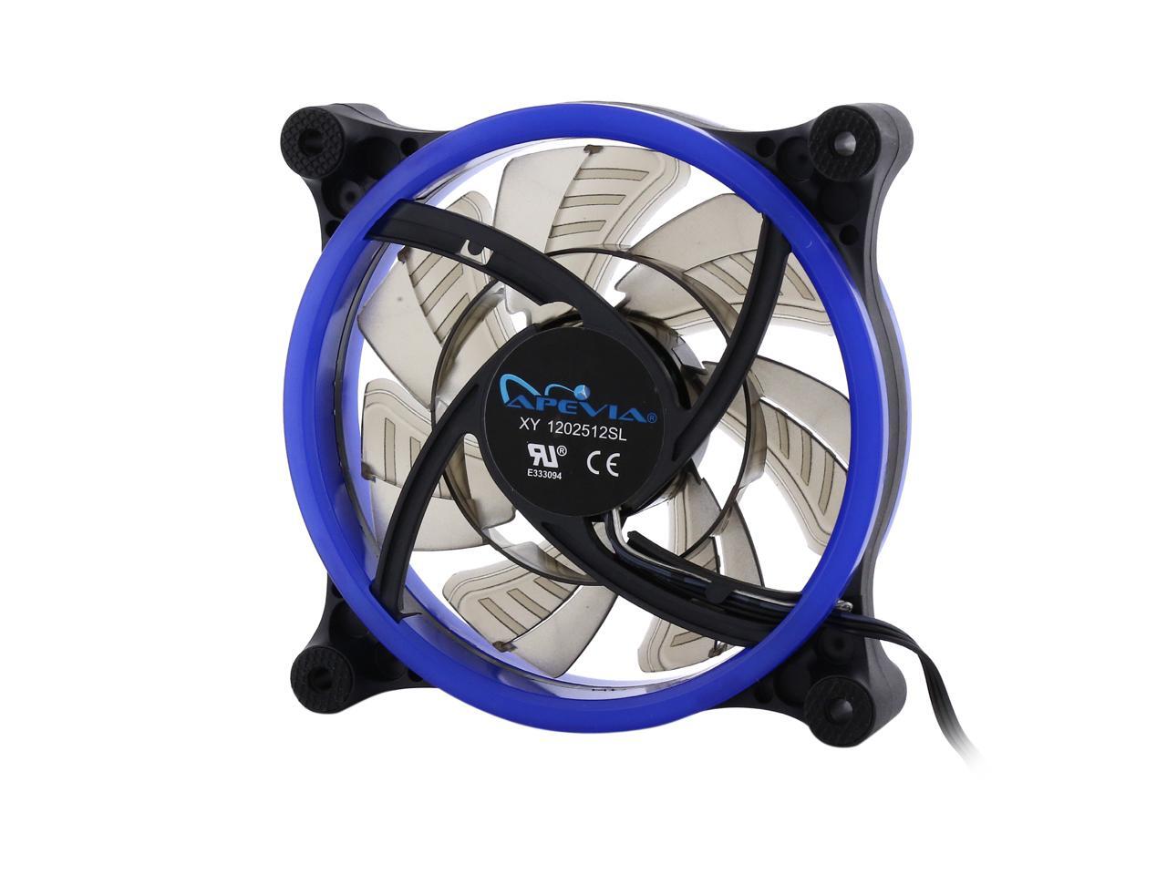 | Features | Apevia 120mm case fan with 32 blue led lights (3 pk) Two colored rings for a bright glow 32 leds within the rings give a solid blue glow to the fan 7 stylish black blades and black frame Four anti-vibration pads to reduce noise Comes with 3 & 4 pin connectors. Can plug into motherboard or power supply. |