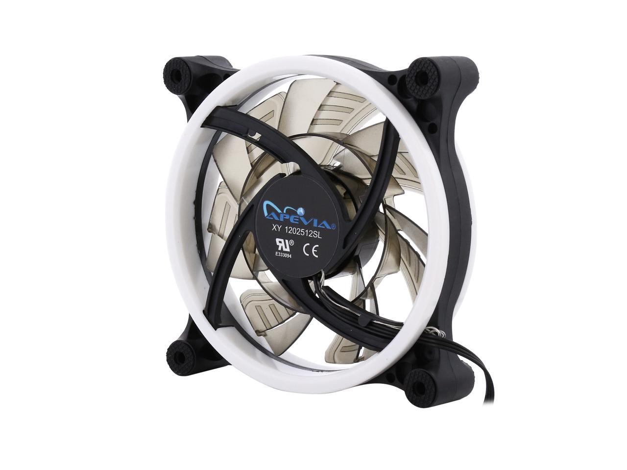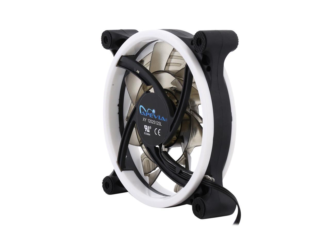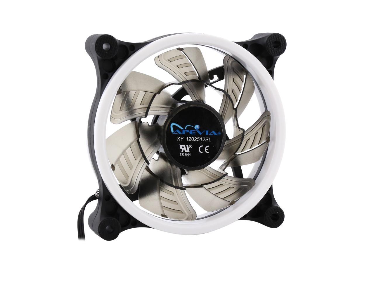 | Features | Apevia 120mm case fan with 32 white led lights (3 pk) Two colored rings for a bright glow 32 leds within the rings give a solid white glow to the fan 7 stylish black blades and black frame Four anti-vibration pads to reduce noise Comes with 3 & 4 pin connectors. Can plug into motherboard or power supply. |