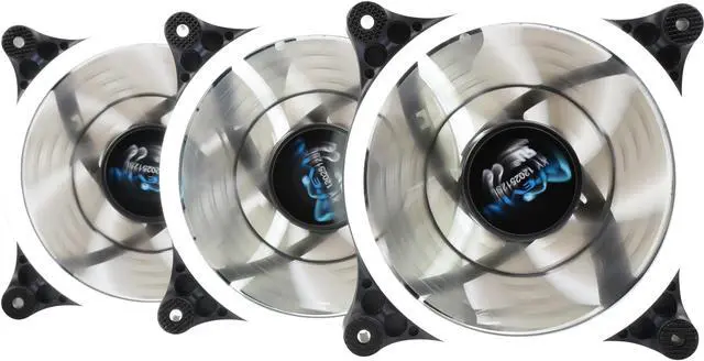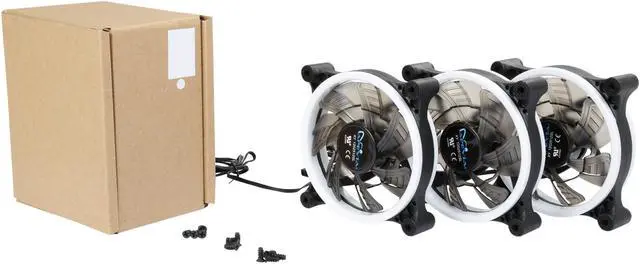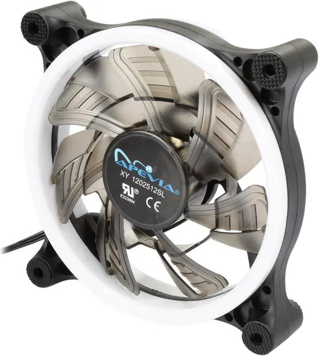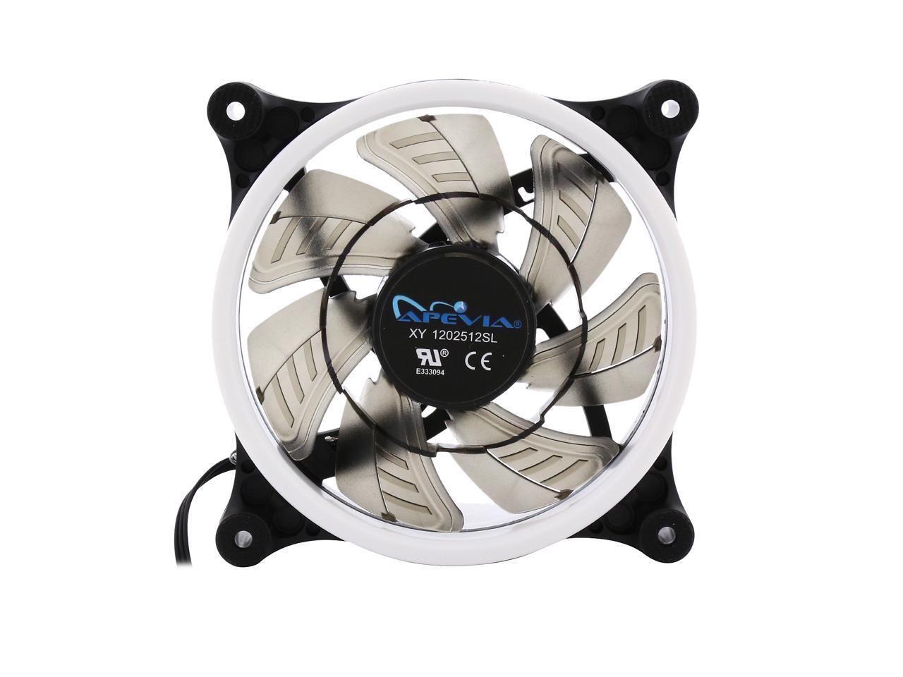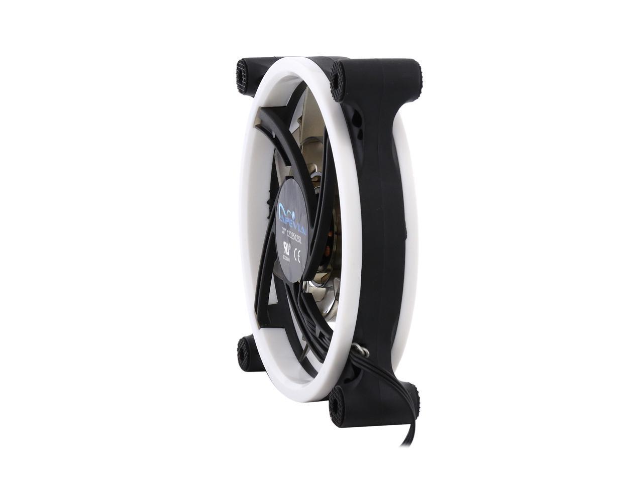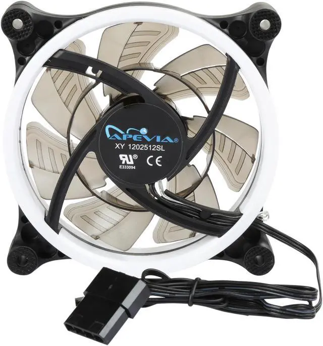 | Features | Apevia 120mm case fan with 32 white led lights (3 pk) Two colored rings for a bright glow 32 leds within the rings give a solid white glow to the fan 7 stylish black blades and black frame Four anti-vibration pads to reduce noise Comes with 3 & 4 pin connectors. Can plug into motherboard or power supply. |