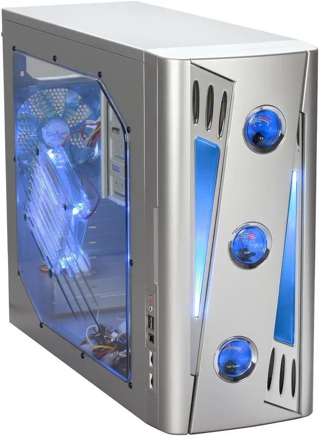 | Features | Modern Sophisticated Stylish Design Large See-through Side Window 1 x UV Air Duct and Filter on Side Window (Thermally Advantaged Chassis) 1 x Front Fan Gauge w/ Fan Controller (Controls up to 5 fans) 1 x Front Temperature Gauge with Blue Back Lighting 1 x Front Volume Gauge and Volume Controller Front Panel LED Lights Intel HD and ac 97 audio support for 7.1 and 5.1 audio systems Fits Graphics Cards up to 11" in length. Fits Motherboard Size up to 11" x 12" |