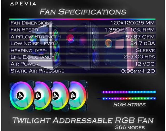 Four 120mm Twilight ARGB Fans + Two Color-Changing Magnetic LED Strips + 4-pin Control Box + RF Remote