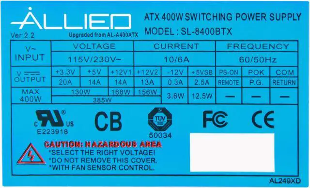The APEX AL-8250SFX power supply is designed for value conscious users. It offers 400W power for your components, and features a unique IC design. The embedded thermal sensor and dual low-noise speed-variable fans work in concert to provide maximized cooling when you do power-eating tasks, and provide a low noise level when you do moderate tasks. With a full array of safety protections, you can compute with peace in mind.