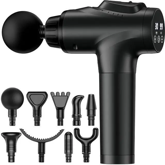 "Relax, unwind, recover & perform with our deep muscle electric back massager Whether you have sore muscle from hardcore weight lifting training, suffer from back pain because of your 9-5 job, or just want to relax & rejuvenate, our deep massage gun puts the power of professional massage treatment in your hands. Features: - Portable: Our percussive massage gun is just the right size to throw into your gym bag or office backpack so you can relax and recover no matter where the day takes you. - Quiet: You can use our sore muscle massager in the airport, at the gym, in the hotel lobby, or in your office without pissing off bystanders or your colleagues - LED display: You can keep track of your speed settings & battery percentage on the blue LED screen - Powerful: The state-of-the-art motor delivers consistent, high penetrating vibrations - Ergonomic: The extra-long handle of our electric massage gun works in either hand and ensures a comfortable use With our personal massage gun, you'll experience a professional-grade massage therapy that will: - Combat muscle soreness - Stimulate muscles - Enhance blood flow - Soften knots - Aid recovery Get a full body massage with our 9 massage heads: Each massage head has a unique shape and different impact level to ensure optimum massaging in the right area. - Roundhead: Used for large muscle groups like the glutes, hamstrings, & quads - Mushroom head: Suitable for abdomen, chest & legs - U-shaped head: Ideal for neck, spine & Achilles tendon - Conehead: Increases circulation around knees & provides joint alignment - Curved head: It aligns with the curves of your feet & hands - Tower head: Used for relaxing soft tissues & sensitive muscles - Air compression head: Suitable for sensitive muscle groups - Spade head: Suitable for whole-body massage - Thumb head: Suitable for chiropractic massage - Sector head: Perfect for neck & spine"