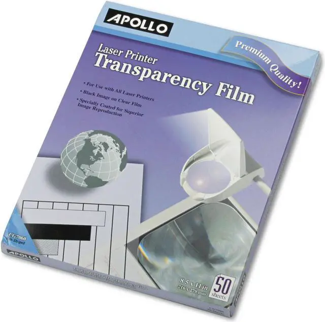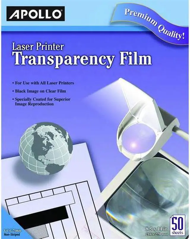 Transfer your data directly to transparency film. Compatible with most laser printers. Prints black on clear background. 8 1/2 x 11 sheets. 50 sheets per box. Color (s): Clear; Width: 8 1/2"; Height: 11".