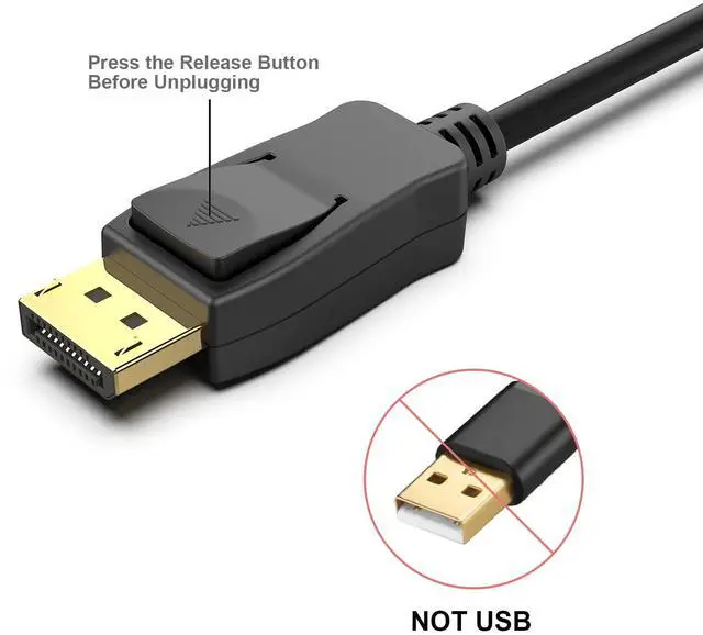 - DisplayPort connector with latches provides a secure connection, the latches will improve the connection stability in usage. When plug out, please press the realse button, and easy to pull out