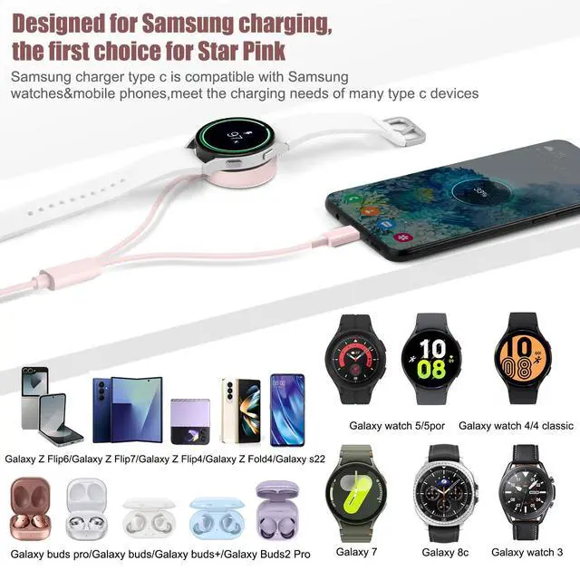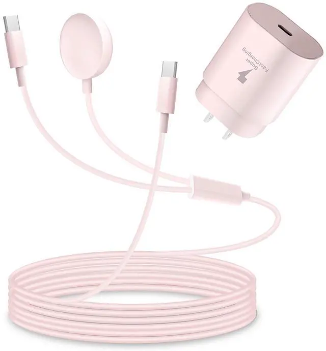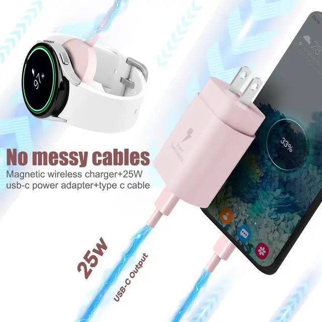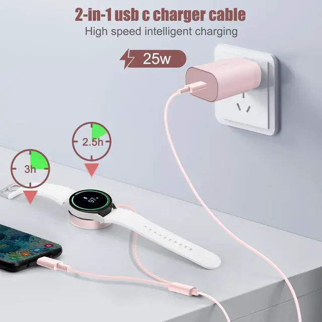 The 2 in 1 Samsung Galaxy Watch 8 charger kit is specialized for Samsung devices. It can charge both phone and watch at the same time, and is also suitable for Samsung earphones and tablets etc. The Galaxy Watch 7 Charger is strong and durable, passing the 10000+ bending test and is protected against overheating, overvoltage and overcurrent. It can keep low temperature, stable and continuous during fast charging. Watch can be fully-charged in 2 hours. The copper core in the c to c type fast charging cable allows for up to 3x charging speed. Suitable for Samsungs type C devices and Android devices to charge. The 25W USB c charger block outputs strong electricity, it can save up to a half of the traditional charging time. Our products have been strictly checked, please rest assured to buy.For a better experience, we strongly recommend using our original Wall power adapter. Using other brand power adapters may cause the watch to not charge Galaxy Watch 8 charger, Galaxy Watch 7 charger/Galaxy Watch 6 charger/Galaxy Watch 6 Classic charger/Galaxy Watch 5 Pro/Galaxy Watch 5 charger/Galaxy Watch 4 charger/Galaxy Watch 4 Classic/Galaxy Watch 3 charger/Galaxy Watch Active 2 charger/Galaxy Watch Active 1 charge
