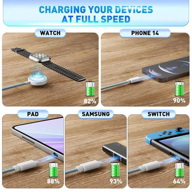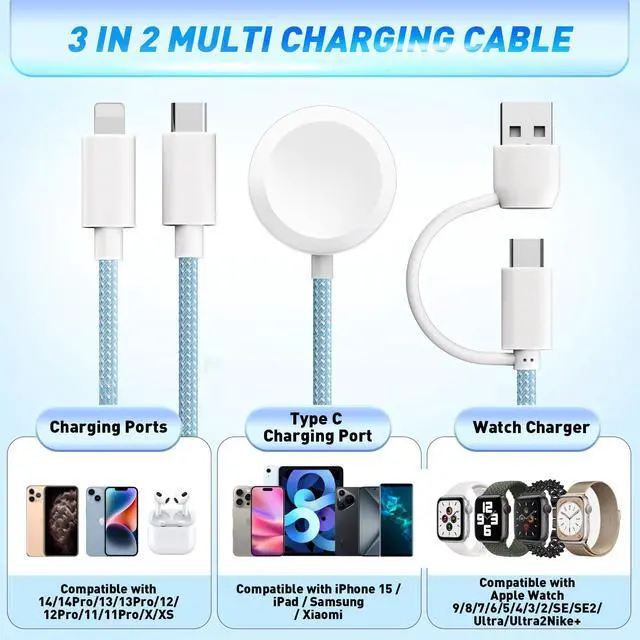 -- This versatile charging solution offers 6 ways to power up your devices: USB C/A to Watch charger, USB C/A for Phone, and USB C/A to Type C Cable. It supports simultaneous charging of up to 3 devices with a USB C/A adapter (not included). Compatible with iWatch ultra/SE 1/2/3 series 11/10/9/8/7/6/5/4/3/2/1,the Compatible with iPhone14/13/12/Pro/Max/iPad,USB C compatible with iPhone 17/16/15/15 Pro/15 Plus/15 Pro Max,Samsung Galaxy S23/ S23+/ S23 Ultra/S22/ S21/ S20/ S20+Note: Please use a 60W or higher adapter for fast charging two devices simultaneously.