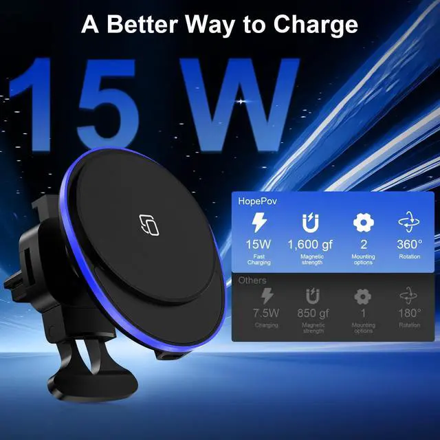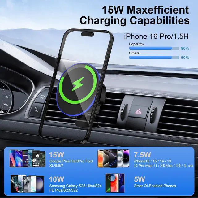 HopePow 15w Car Mount Wireless Charger Stand Fast Charging Kickstand Compatible for Samsung Galaxy S25 Edge Ultra/S24/S23/S22,iPhone 16e 16 Pro Max Plus 15