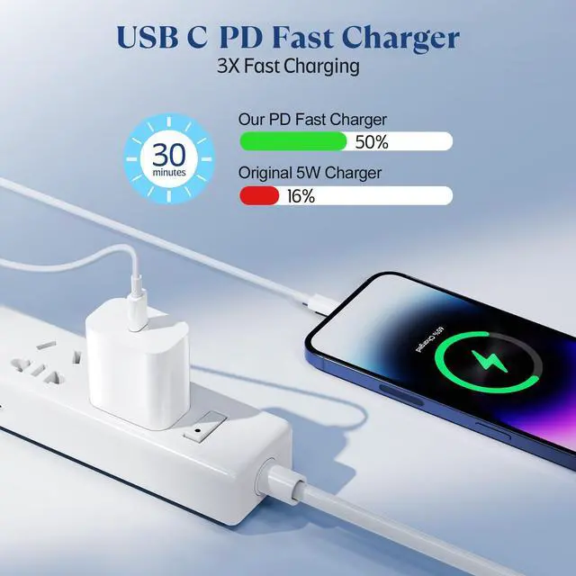 - 3X Fast Charging:Charge iphone 14 to 100% in less time—that’s up to 3× faster than original 5W charger.