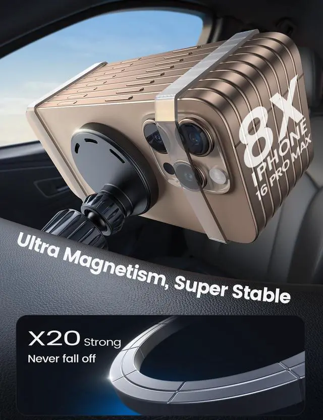 20X Upgraded Strong Magnets: This car mount built-in N55 magnets, powerful magnets with 1,600 g holding. Your phone stays securely to the charger even on bumpy roads. This car charging holder is a top choice for keeping your phone charged and safe while driving.