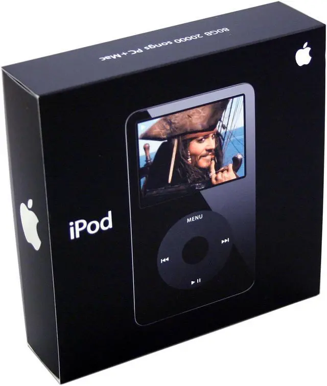Apple’s sleek black iPod has become the icon of the portable music world. Everyone wants to imitate it or get it. So get it. This 80 GB model will carry about 20,000 songs, or well over six weeks of music, played 24 hours a day!