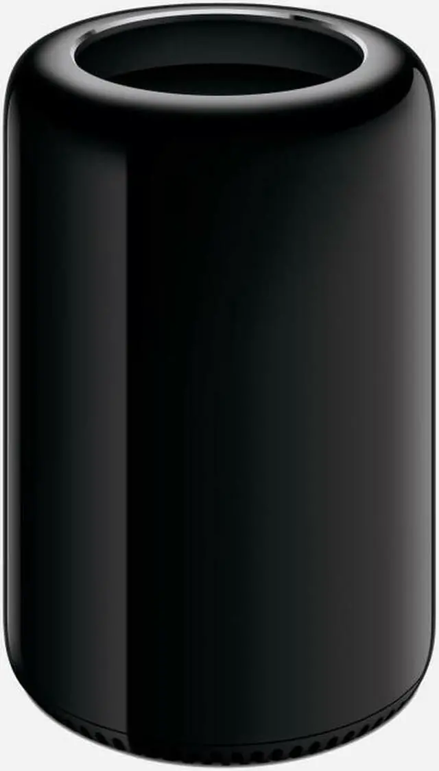 Apple explains that these "Space Gray" cylinder Mac Pro models are "designed around an innovative unified thermal core" and have not only faster processors than earlier models but also dual workstation class graphics processors, faster memory, and faster PCIe 2.0 x4 flash storage.