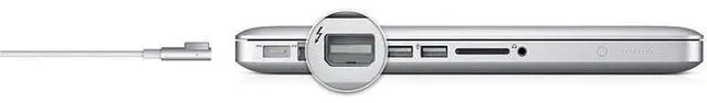 You may notice an unfamiliar logo next to one of the ports on the left side of the system. This is Thunderbolt, a high-speed interface that can move data at an amazing 10 Gbps, which is double that of USB 3.0. The MacBook Pro has a FireWire 800 and two USB 3.0 ports as well. The Thunderbolt port also doubles as a display output because it shares the same physical form factor as a Mini DisplayPort. You can daisy-chain up to six devices, so you'll be able to connect high-speed external storage and an external Apple LED Cinema display via the same port!