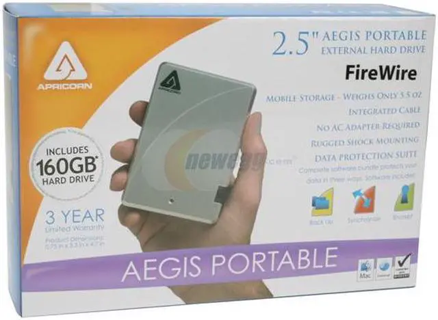 Put the power of FireWire to work for you. This 160 GB Aegis portable hard drive has the FireWire cable built in so you never have to worry about where it is. Inside the case, the 2.5" drive is cradled by a 16-point shock mount system that protects it from drops at any angle.