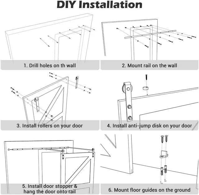 - Adjustable & Safe - Adjustable roller stopper can be fixed at any position of the track, while anti-jump disks fill the space between the top of the door & track bottom to prevent rollers from jumping off the track and ensure added safety; Strong floor guide to stabilize door movement without swaying back and forth