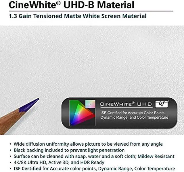 The screen is made from CineWhite (Tension Matte White), a multi-layer PVC material known for its broad light dispersion, uniform diffusion, and true color rendition. This makes it an ideal choice for high-contrast ratio projectors used in both commercial and residential presentations. The CineWhite material not only matches the performance of our MaxWhite product but also enhances the viewing experience with superior surface flatness.