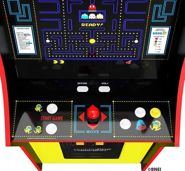 Arcade1Up BANDAI NAMCO Entertainment Legacy Edition Arcade CabinetOriginally founded under the name Nakamura Seisakujo in 1955, the company that would become BANDAI NAMCO Entertainment was initially in the coin-operated amusement ride business. Entering the video game industry at the end of the 70s, BANDAI NAMCO Entertainments titles would quickly change the world of entertainment forever. With their release of GALAXIAN, GALAGA, and PAC-MAN the best-selling arcade game of all time BANDAI NAMCO Entertainments titles were instrumental in ushering in the golden age of arcade games and have impacted pop-culture across generations.Twelve games, one cabinet, unlimited retro gaming fun. Add the BANDAI NAMCO Entertainment Legacy Edition to your home and have a BLAST anytimeno quarters required!Brought to you by Arcade1Up, this is an absolute must-have for your family game room, game cave, or even in the office. Arcade1Up home arcade cabinets play great, look great, and are instant conversation pieces.And what a phenomenally iconic game list this isa dozen classic BANDAI NAMCO Entertainment titles, packed inside! PAC-MAN, PAC-LAND, PAC-MANPLUS, SUPER PAC-MAN, PAC %26 PAL, PAC-MANIA, GALAXIAN, GALAGA, DIG DUG, DIG DUGII, MAPPY, and ROMPERS. ALL included. Switch up to any included game at will with the easy to navigate on-screen menus. Additionally, this BANDAI NAMCO Entertainment Legacy Edition includes a Custom riser, if you need to give it some lift!Iconic arcade games. Pop culture imagery that has stood the test of time. Nostalgia that transcends generations. We call this the Legacy Edition for a reasonmake that many reasons!